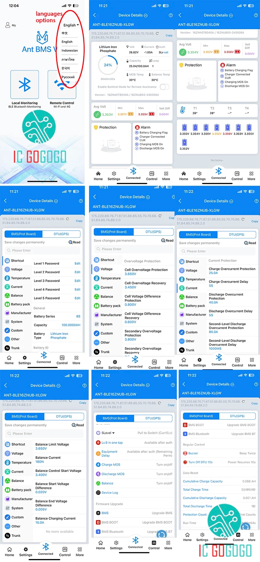 - Λειτουργία Bluetooth: Μπορείτε να δείτε τις παραμέτρους στην εφαρμογή, να ρυθμίσετε τις παραμέτρους διαφορετικών τύπων στοιχείων μπαταρίας, τον αριθμό των σειρά, χωρητικότητα μπαταρίας, τάση κ.λπ., και εμφάνιση πληροφοριών προστασίας και αρχείων σφαλμάτων.