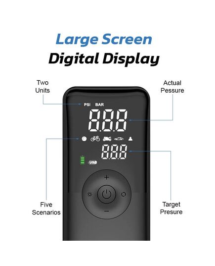 Διαθέτει ψηφιακή οθόνη, κουμπί ελέγχου και LED φως για χρήση στο σκοτάδι, ενώ χρησιμοποιεί δύο επαναφορτιζόμενες μπαταρίες (4000mAh συνολικά). Η κατασκευή της τρόμπας είναι μεταλλική και ενσωματώνει ανθεκτικό σωλήνα αέρα 120 χιλιοστών. Η χρήση της είναι πολύ εύκολη, καθώς διαθέτει ενσωματωμένο αισθητήρα πίεσης που αυτοματοποιεί τη διαδικασία. Απλά επιλέξτε τα επίπεδα PSI ή BAR πατήστε το κουμπί έναρξης και όλα τα άλλα θα τα κάνει μόνη της.