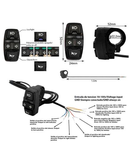 Αδιάβροχος Πίνακας κουμπιών με καλώδιο 1,5M, για εύκολη και ασφαλή πρόσβαση στις λειτουργίες και τα χαρακτηριστικά του σκούτερ σας. Είναι εύκολο στην εγκατάσταση και βελτιώνει σημαντικά την εμπειρία οδήγησης. Διαθέτει λειτουργία φωτισμού έκτακτης ανάγκης πατώντας και τα δύο φλας ταυτόχρονα.