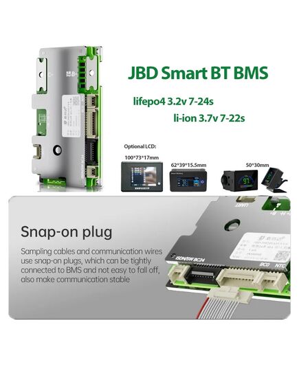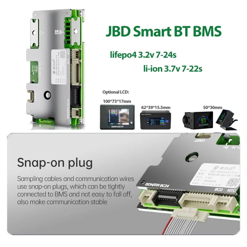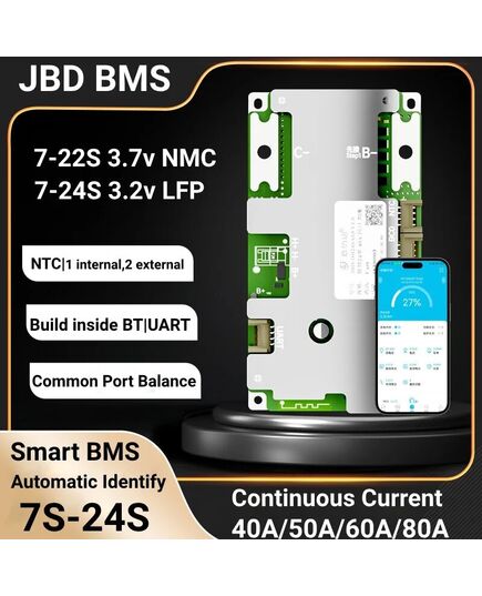 Tο Smart BMS JBD 7S-24S 50A-100A UART DB24SA03 όλα τα πρότυπα ασφαλείας και είναι κατάλληλο για μπαταρίες λιθίου με διαφορετικές χημικές ιδιότητες, όπως ιόντα λιθίου, πολυμερές λιθίου, φωσφορικό σίδηρο λιθίου, κ.λπ.