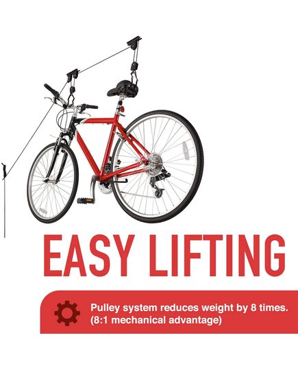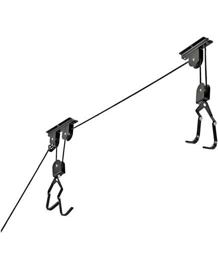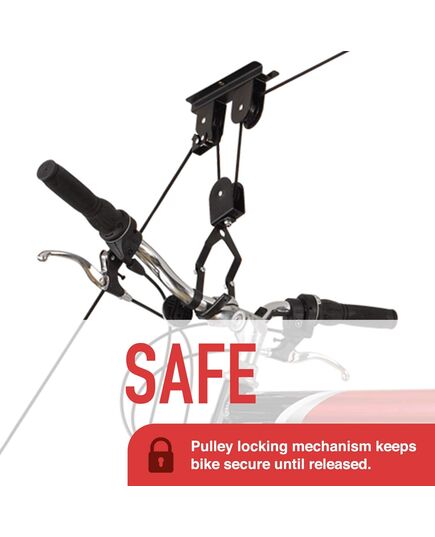 Ο τέλειος τρόπος για να αποθηκεύσετε το ποδήλατό σας από πάνω και να ελευθερώσετε επιπλέον χώρο στο γκαράζ. Το Bike Lift χρησιμοποιεί ένα σύστημα σχοινιού και τροχαλίας που είναι τοποθετημένο στο ταβάνι σας. Σηκώστε και χαμηλώστε το ποδήλατο σας έως και 3.5 μέτρα, τοποθετώντας απλά τα άγκιστρα στο κάθισμα και το τιμόνι και τραβώντας το σχοινί. Όταν είστε έτοιμοι να οδηγήσετε, ξεκλειδώστε το σχοινί και κατεβάστε το ποδήλατό σας… δεν χρειάζονται σκάλες! Ένας μοναδικός μηχανισμός ασφάλισης συγκρατεί το σχοινί με ασφάλεια στη θέση του.