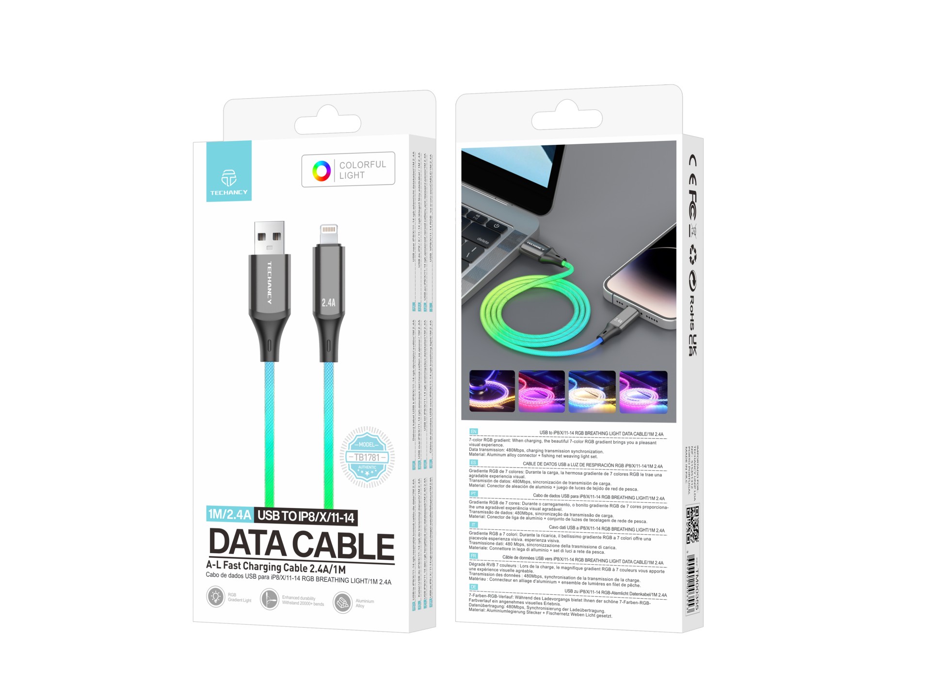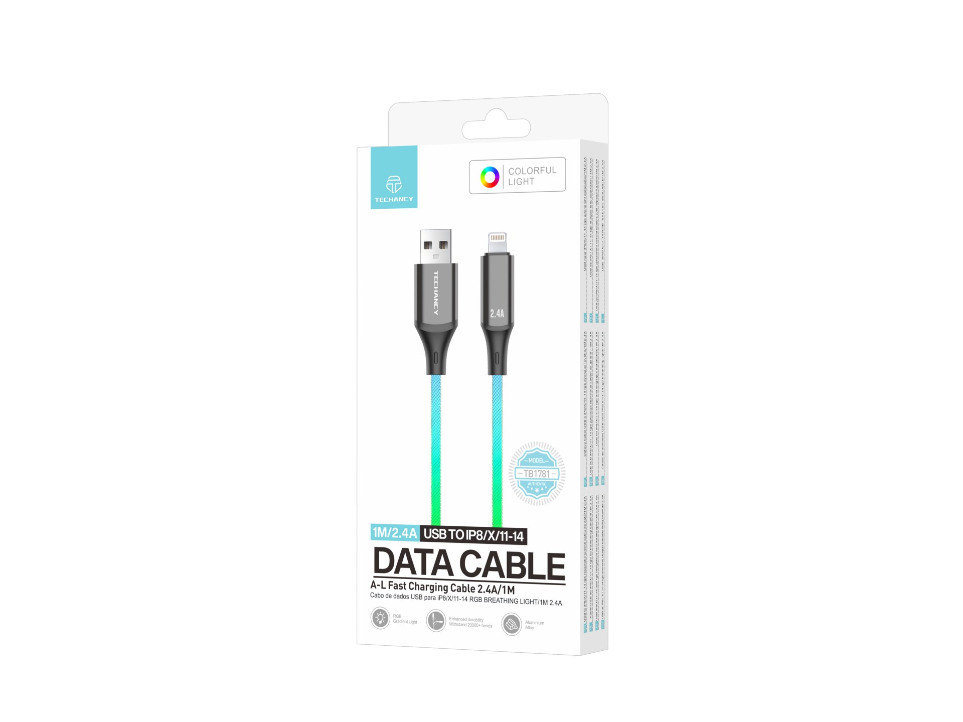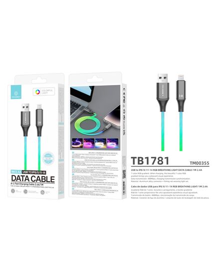 Techancy TB1781 – USB to Lighting Καλώδιο Δεδομένων 2.4A με RGB Φωτισμό 7 Χρωμάτων, 1M