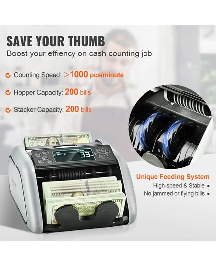 Η καταμέτρηση χαρτονομισμάτων είναι μια εύκολη, ακριβής και ευχάριστη εργασία μέσω του Ψηφιακού μετρητή χαρτονομισμάτων VEVOR ALK07 που είναι κατάλληλος για τα περισσότερα νομίσματα στον κόσμο.